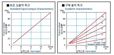 1. 파형제어방식 위상제어, 사이클 제어 (간헐식, 연속식) 2. 표준입출력특성 수동, 자동, 본 유닛의 표준입출력특성은 우측 그래프와 같습니다. (위상제어, 사이클제어) 3. 구배출력특성 구배설정기(가변저항기)를 설치함에 따라 최대 출력전압을 임의로 가변설정 가능합니다. |