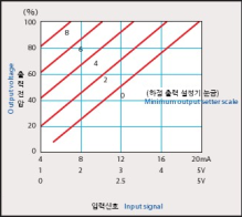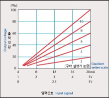 | 본 유닛의 표준 입출력 특성은 아래 그래프와 같습니다.(위상제어, 사이클제어) | 구배설정기(가변저항기)를 설치함에 따라 최대 출력 전압을 임의로 가변설정할 수 있습니다. | 하점출력설정기(가변저항기)를 설치함에 따라 최소 출력 전압을 임의로 가변 설정할 수 있습니다. | ||